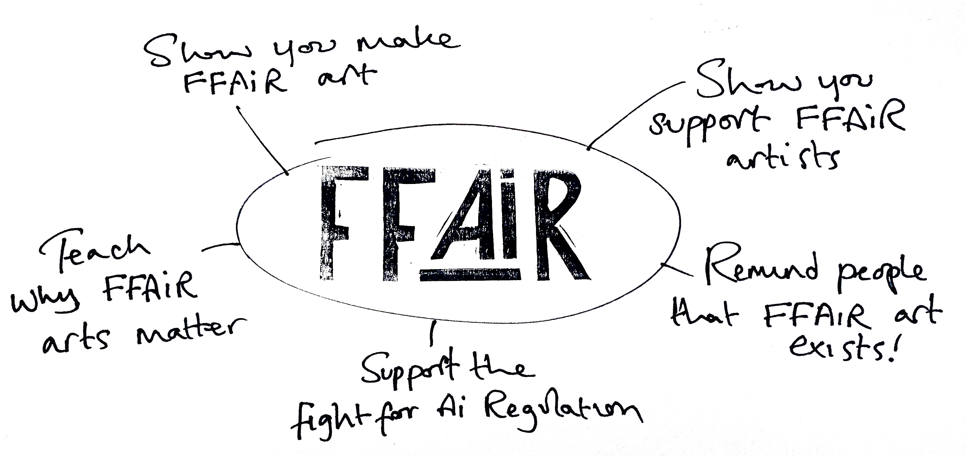 I'm aware that some artists explicitly experiment with Ai to explore the possibilities of making unique new work using data supplied with consent. I think this is very different and maybe there is a place for this somewhere albeit with tighter controls and regulations over the data. However this art is not FFAiR art and I think we should still safeguard some spaces which are committed to being entirely Ai free.